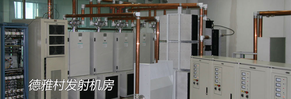德雅村机房天馈系统,由天馈系统由多工器、同轴开关、硬馈、开关板和天线几部 分组成。其中天线部分又包括软馈管、功分器、分馈线、带反射板的振子等。德雅村发射机房有3幅天线;6台5KW发射机和10KW 备机经六工器合用一幅四层四面的水平极化天线;93.8发射机独用一幅垂直极化天线,1KW备机也单独使用一幅垂直极化天线。